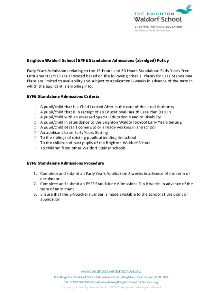 Brighton Waldorf School | EYE Standalone Admissions (abridged) Policy