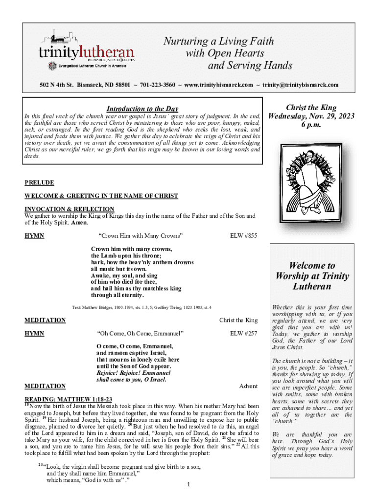 Nurturing a Living Faith with Open Hearts and Serving Hands 502 N 4th St. Bismarck, ND 58501 7012233560 www.trinitybismarck.com trinity@trinitybismarck.comIntroduction to the DayIn this final week
