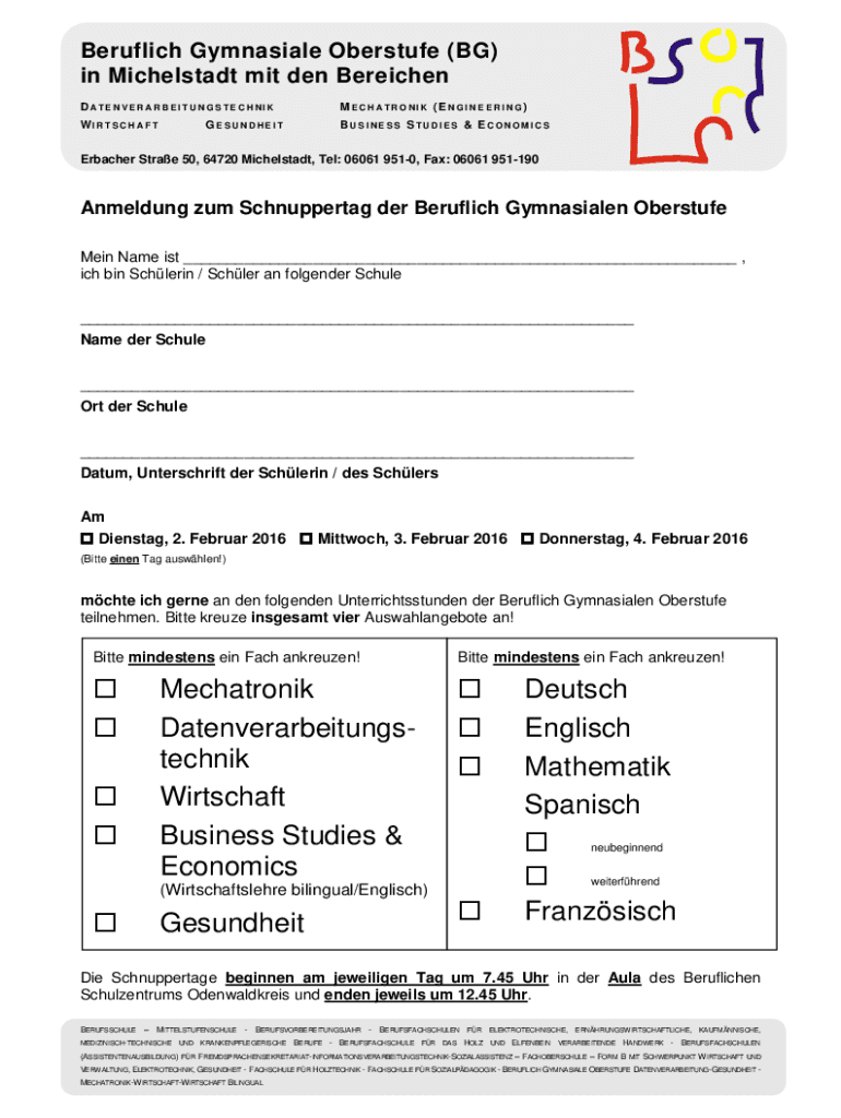 Reichen Sie den vollständig ausgefüllten Anmeldebogen fristgerecht beim bs0 michelstadt berufliches Gymnasium ein.