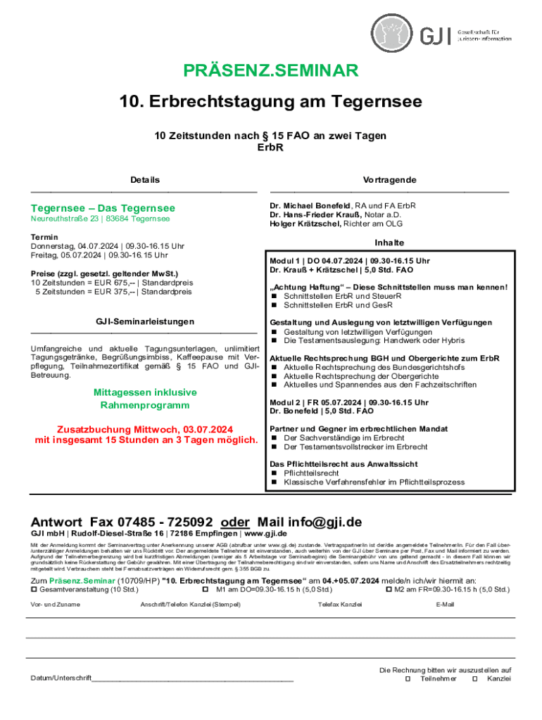PRSENZ.SEMINAR 10. Erbrechtstagung am Tegernsee 10 Zeitstunden nach 15 FAO an zwei Tagen ErbR DetailsVortragende______Tegernsee Das TegernseeDr. Michael Bonefeld, RA und FA ErbR Dr. HansFrieder Krau,