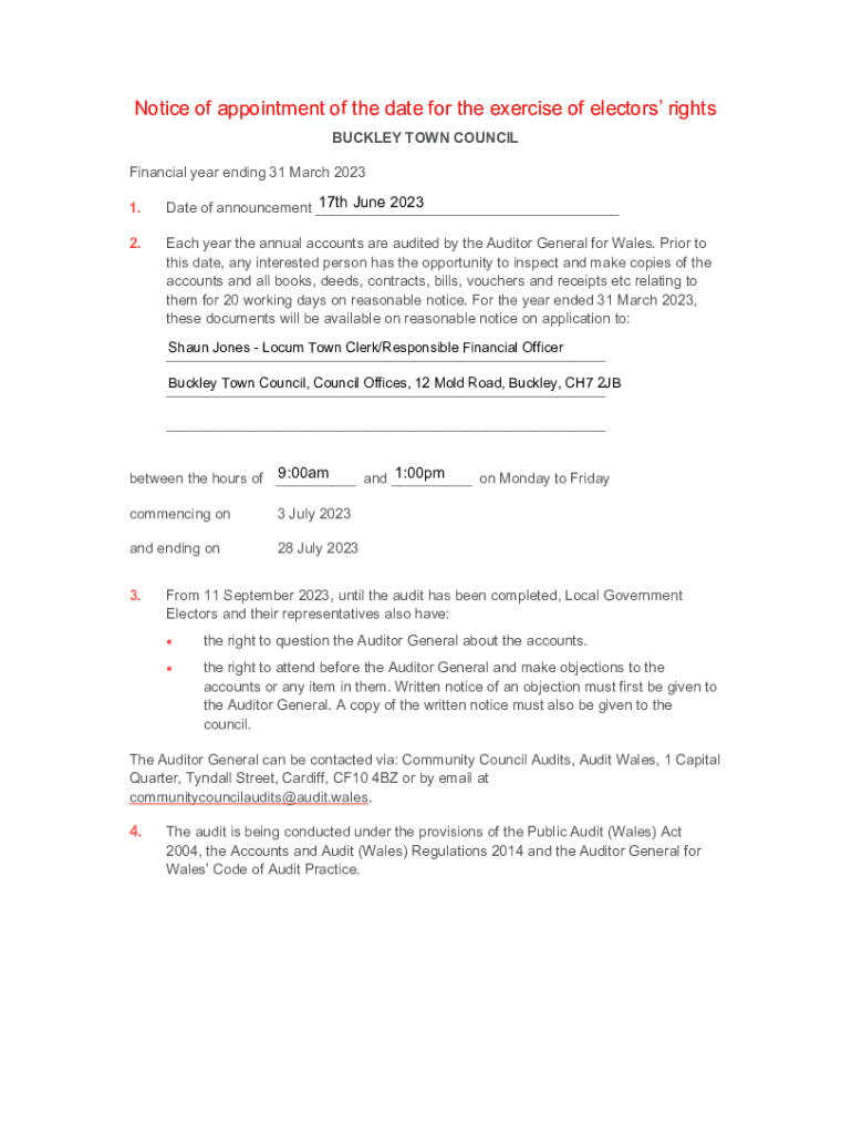 Notice of appointment of the date for the exercise of electors rights BUCKLEY TOWN COUNCIL Financial year ending 31 March 2023 1. 2.17th June 2023 Date of announcement ___ Each year the annual accounts