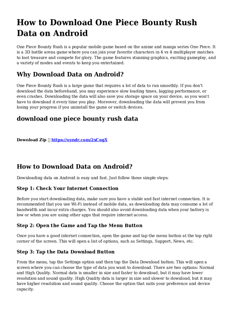 How to Download One Piece Bounty Rush Data on Android One Piece Bounty Rush is a popular mobile game based on the anime and manga series One Piece. It is a 3D battle arena game where you can join