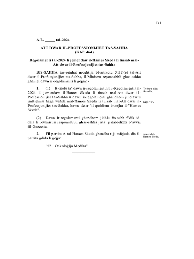 B1A.L. ___ tal2024 ATT DWAR ILPROFESSJONIJIET TASSAA (KAP. 464) Regolamenti tal2024 li jemendaw ilames Skeda li tinsab malAtt dwar ilProfessjonijiet tasSaa BISSAA tassetgat mogtija blartikolu 51(1)(e)