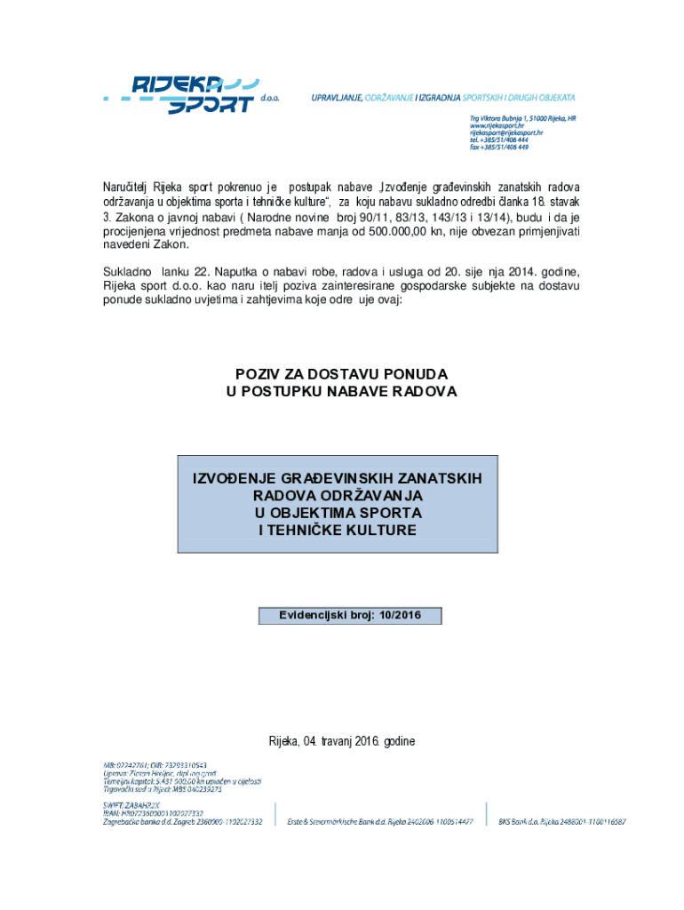 Naruitelj Rijeka sport pokrenuo je postupak nabave Izvoenje graevinskih zanatskih radova odravanja u objektima sporta i tehnike kulture, za koju nabavu sukladno odredbi lanka 18. stavak 3. Zakona