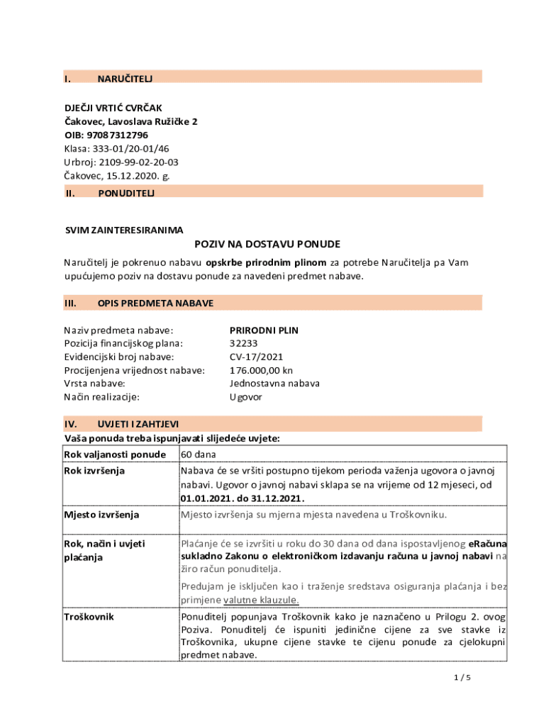 I.NARUITELJDJEJI VRTI CVRAK akovec, Lavoslava Ruike 2 OIB: 97087312796 Klasa: 33301/2001/46 Urbroj: 210999022003 akovec, 15.12.2020. g. II.PONUDITELJSVIM ZAINTERESIRANIMAPOZIV NA DOSTAVU PONUDE Naruitelj