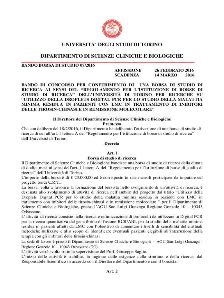 UNIVERSITA\' DEGLI STUDI DI TORINO DIPARTIMENTO DI SCIENZE CLINICHE E BIOLOGICHE ___BANDO BORSA DI STUDIO 07/2016 AFFISSIONE SCADENZA26 FEBBRAIO 2016 14 MARZO 2016BANDO DI CONCORSO PER CONFERIMENTO