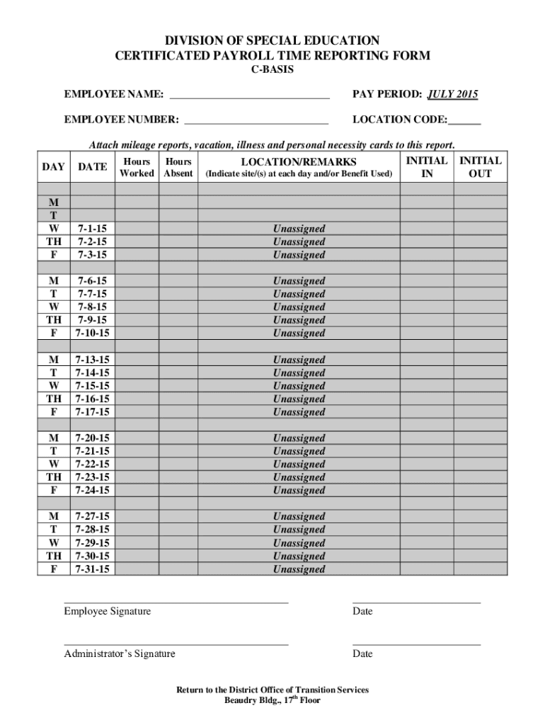 EMPLOYEE NAME: ___PAY PERIOD: JULY 2015EMPLOYEE NUMBER: ___LOCATION CODE:Attach mileage reports, vacation, illness and