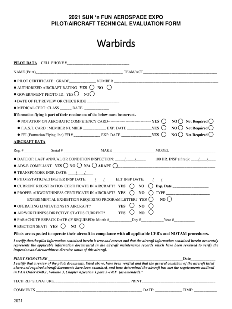 2021 SUN n FUN AEROSPACE EXPO PILOT/AIRCRAFT TECHNICAL EVALUATION FORMWarbirds PILOT DATACELL PHONE #___NAME (Print)___ TEAM/ACT___ PILOT CERTIFICATE: GRADE___ NUMBER ___ AUTHORIZED AIRCRAFT RATING