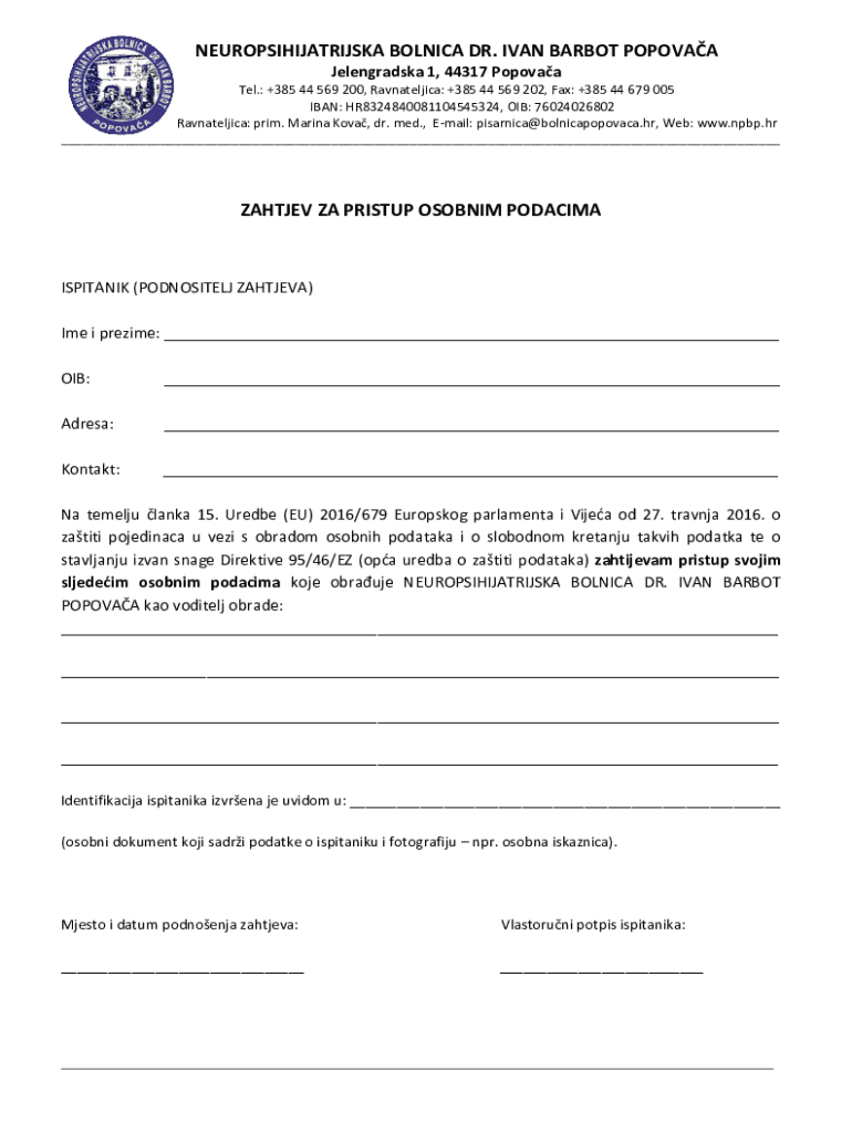 NEUROPSIHIJATRIJSKA BOLNICA DR. IVAN BARBOT POPOVAA Jelengradska 1, 44317 Popovaa Tel.: +385 44 569 200, Ravnateljica: +385 44 569 202, Fax: +385 44 679 005 IBAN: HR8324840081104545324, OIB: 76024026802