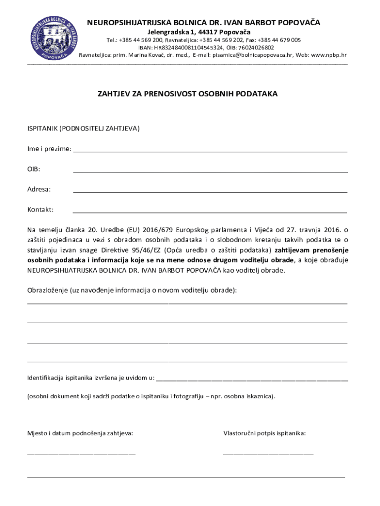 NEUROPSIHIJATRIJSKA BOLNICA DR. IVAN BARBOT POPOVAA Jelengradska 1, 44317 Popovaa Tel.: +385 44 569 200, Ravnateljica: +385 44 569 202, Fax: +385 44 679 005 IBAN: HR8324840081104545324, OIB: 76024026802