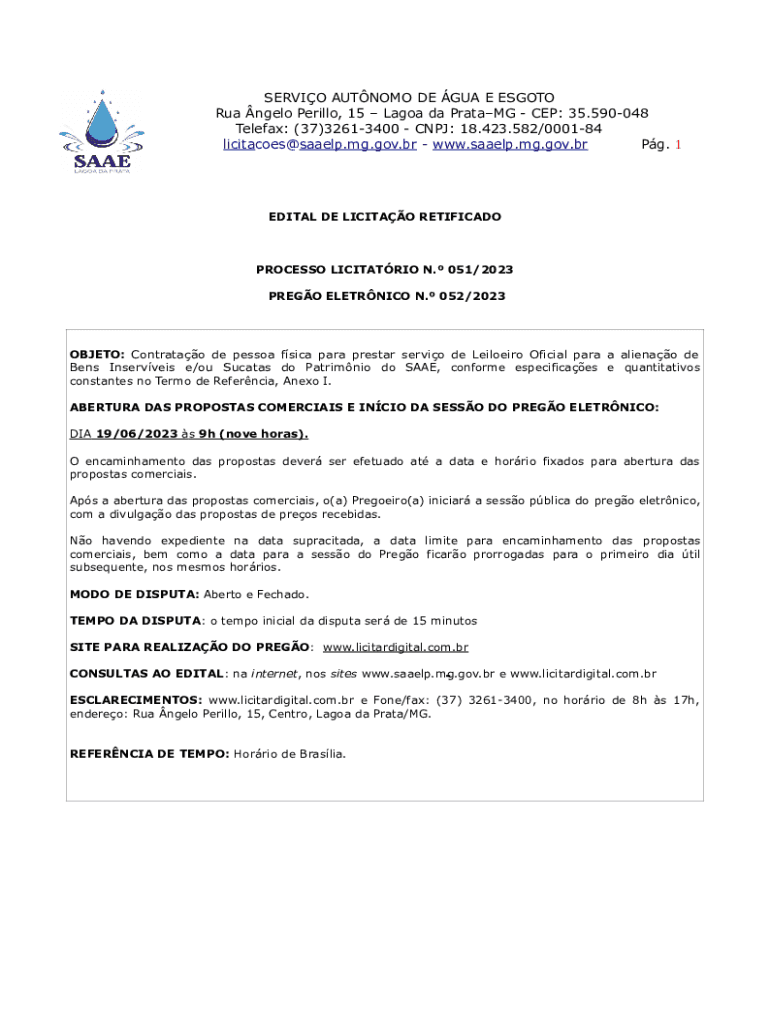 SERVIO AUTNOMO DE GUA E ESGOTO Rua ngelo Perillo, 15 Lagoa da PrataMG CEP: 35.590048 Telefax: (37)32613400 CNPJ: 18.423.582/000184 licitacoes@saaelp.mg.gov.br www.saaelp.mg.gov.br Pg. 1EDITAL DE LICITAO