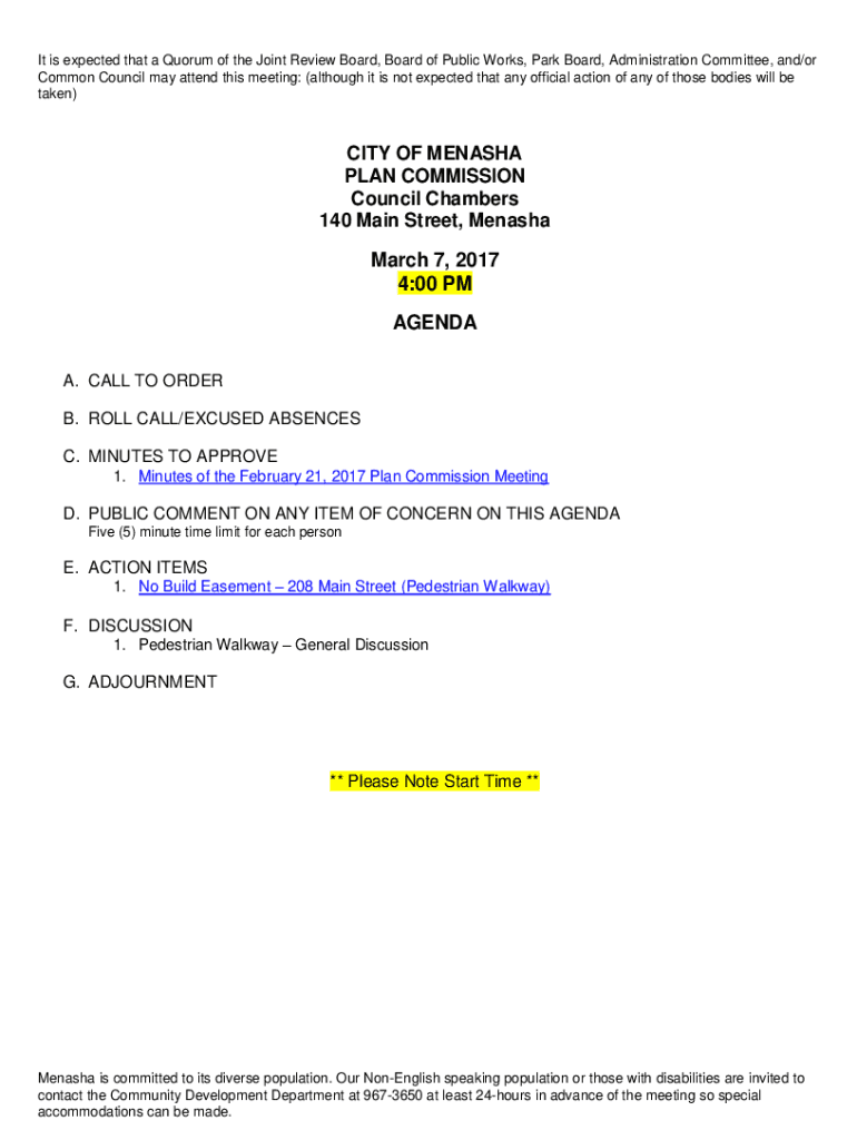 It is expected that a Quorum of the Joint Review Board, Board of Public Works, Park Board, Administration Committee, and/or Common Council may attend this meeting: (although it is not expected that