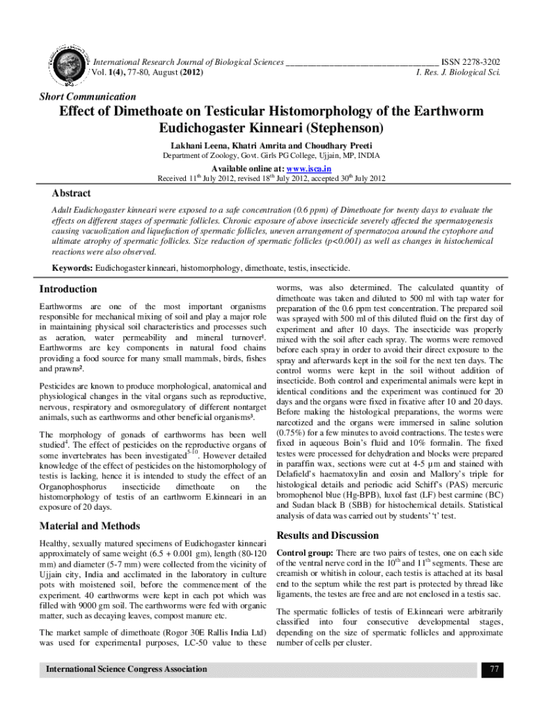 International Research Journal of Biological Sciences ___ ISSN 22783202 Vol. 1(4), 7780, August (2012) I. Res. J. Biological Sci.Short CommunicationEffect of Dimethoate on Testicular Histomorphology