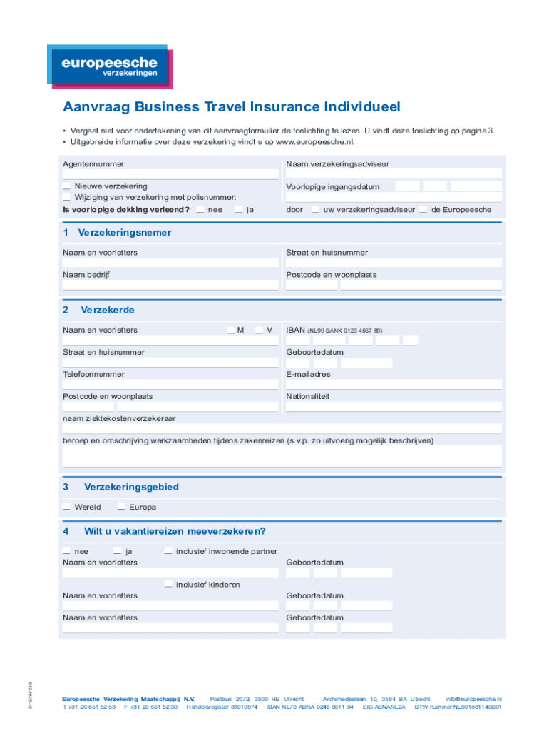 Aanvraag Business Travel Insurance Individueel Vergeet niet voor ondertekening van dit aanvraagformulier de toelichting te lezen. U vindt deze toelichting op pagina 3. Uitgebreide informatie over