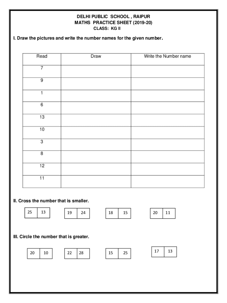 DELHI PUBLIC SCHOOL , RAIPUR MATHS PRACTICE SHEET (201920) CLASS: KG III. Draw the pictures and write the number names for the given number.ReadDrawWrite the Number name7 9 1 6 13 10 3 8 12 11II.