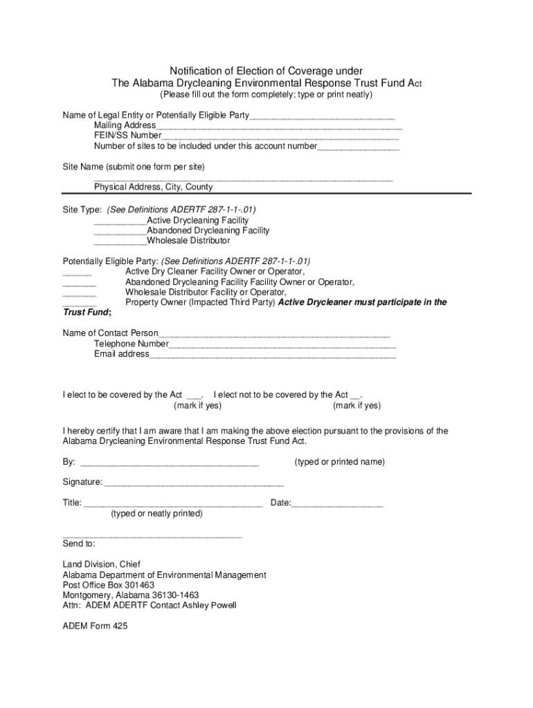 Notification of Election of Coverage under The Alabama Drycleaning Environmental Response Trust Fund A ct (Please fill out the form completely; type or print neatly) Name of Legal Entity or Potentially