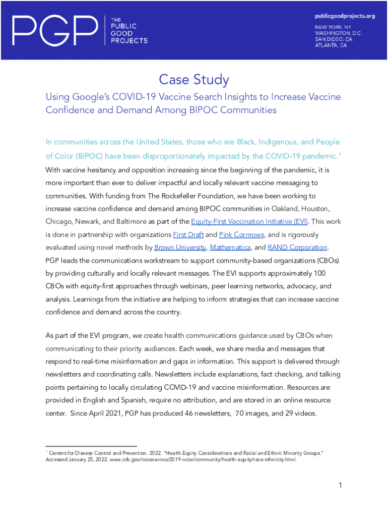 Case Study Using Googles COVID19 Vaccine Search Insights to Increase Vaccine Confidence and Demand Among BIPOC Communities In communities across the United States, those who are Black, Indigenous,