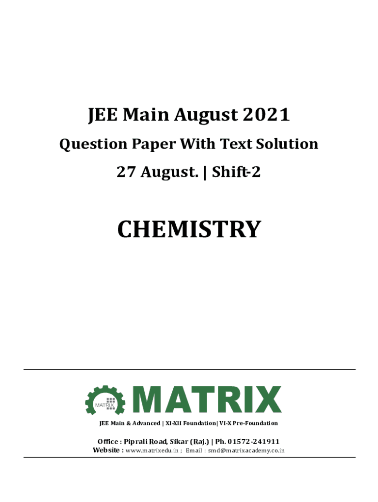 JEE Main August 2021 Question Paper With Text Solution27 August. | Shift2CHEMISTRYMATRIXJEE Main & Advanced | XIXII Foundation| VIX PreFoundationOffice : Piprali Road, Sikar (Raj.) | Ph. 01572241911
