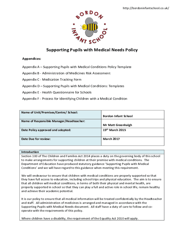 http://bordoninfantschool.co.uk/Supporting Pupils with Medical Needs Policy Appendices: Appendix A Supporting Pupils with Medical Conditions Policy Template Appendix B Administration of Medicines