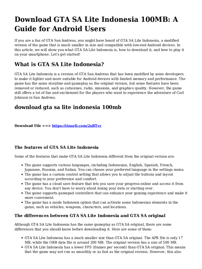 Download GTA SA Lite Indonesia 100MB: A Guide for Android Users If you are a fan of GTA San Andreas, you might have heard of GTA SA Lite Indonesia, a modified version of the game that is much smaller