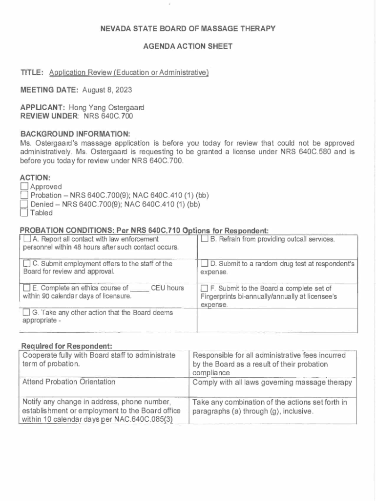 NEVADA STATE BOARD OF MASSAGE THERAPY AGENDA ACTION SHEET TITLE: Application Review (Education or Administrative) MEETING DATE: August 8, 2023 APPLICANT: Hong Yang Ostergaard REVIEW UNDER: NRS 640C.700