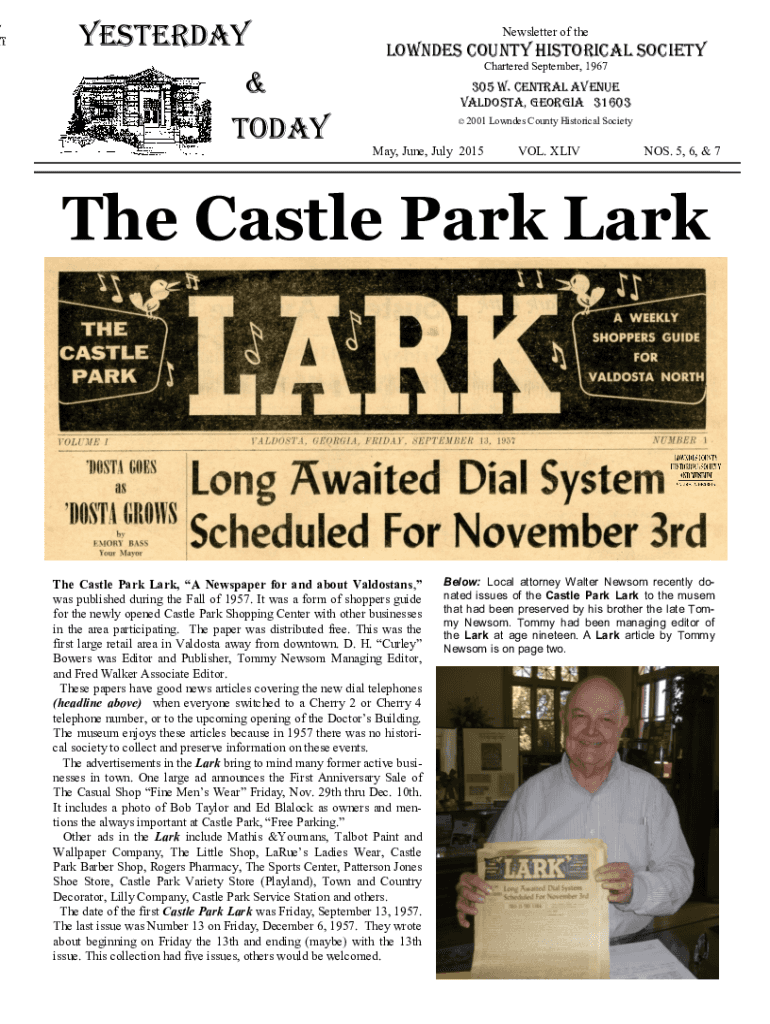 Yesterday & TodayNewsletter of theLowndes County Historical Society Chartered September, 1967305 W. Central Avenue Valdosta, Georgia 31603 2001May, June, July 2015Lowndes County Historical SocietyVOL.