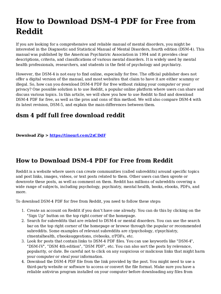 How to Download DSM4 PDF for Free from Reddit If you are looking for a comprehensive and reliable manual of mental disorders, you might be interested in the Diagnostic and Statistical Manual of Mental