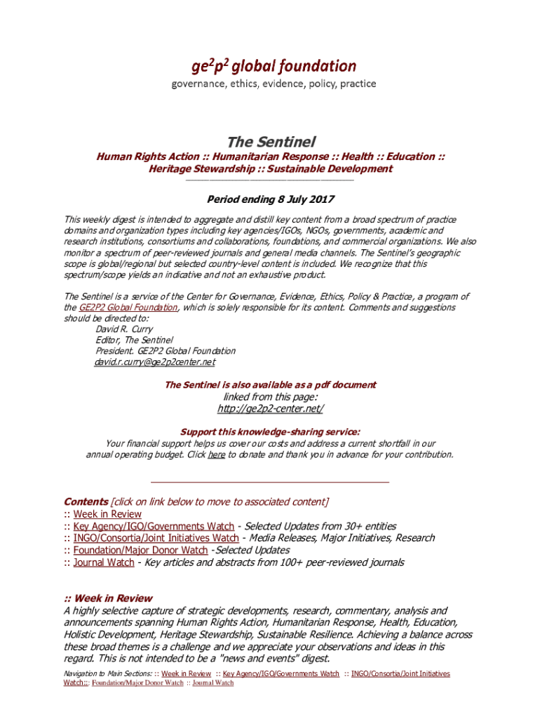 The SentinelHuman Rights Action :: Humanitarian Response :: Health :: Education :: Heritage Stewardship :: Sustainable Development ___Period ending 8 July 2017 This weekly digest is intended to aggregate