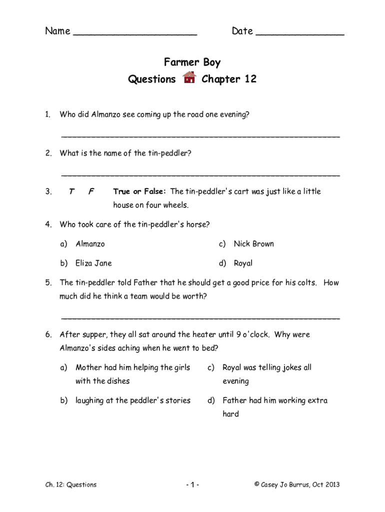 Print Use your Browser BackName ___to Return to Date ___ Previous PageFarmer Boy Questions 1.Chapter 12Who did Almanzo see coming up the road one evening? ___2.What is the name of the tinpeddler?