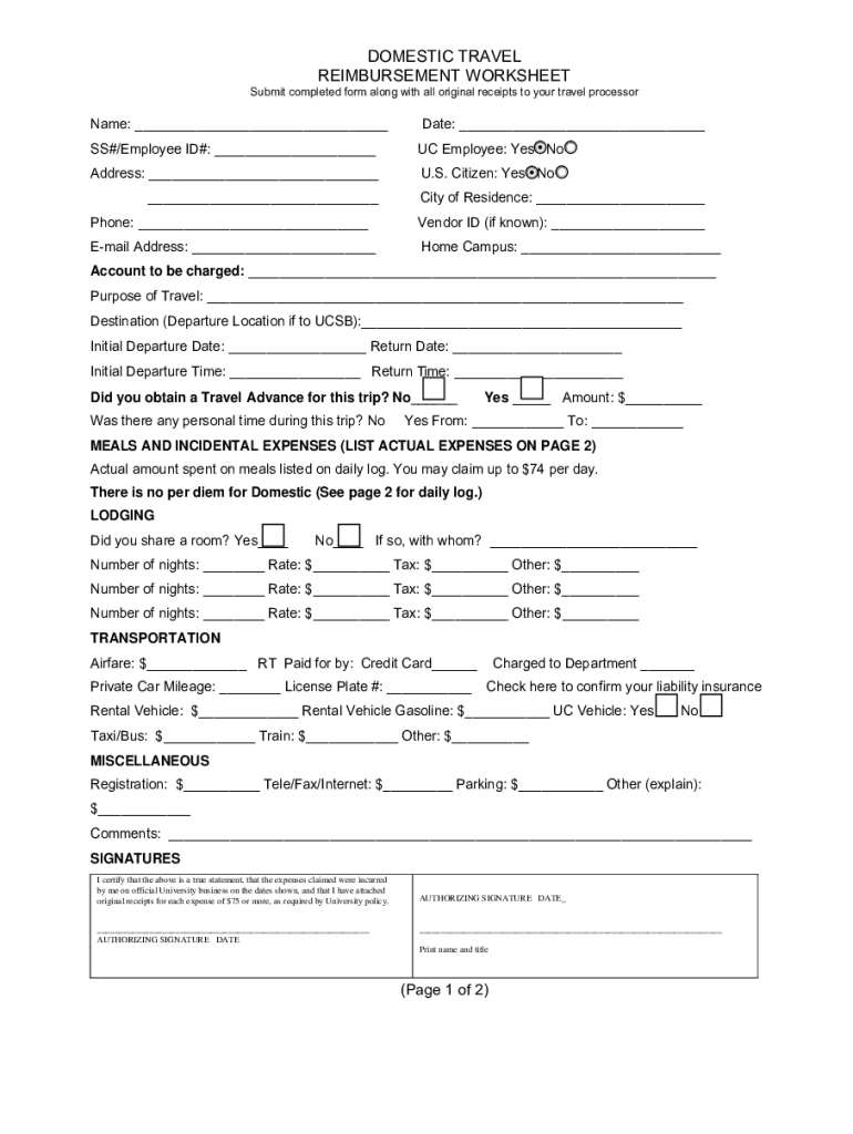 DOMESTIC TRAVEL REIMBURSEMENT WORKSHEETSubmit completed form along with all original receipts to your travel processorName: ___Date: ___SS#/Employee ID#: ___UC Employee: Yes NoAddress: ___U.S. Citizen: