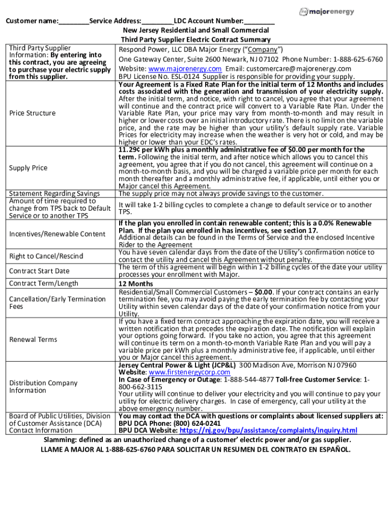 Customer name:___Service Address:___ LDC Account Number:___ New Jersey Residential and Small Commercial Third Party Supplier Electric Contract Summary Third Party Supplier Respond Power, LLC DBA Major
