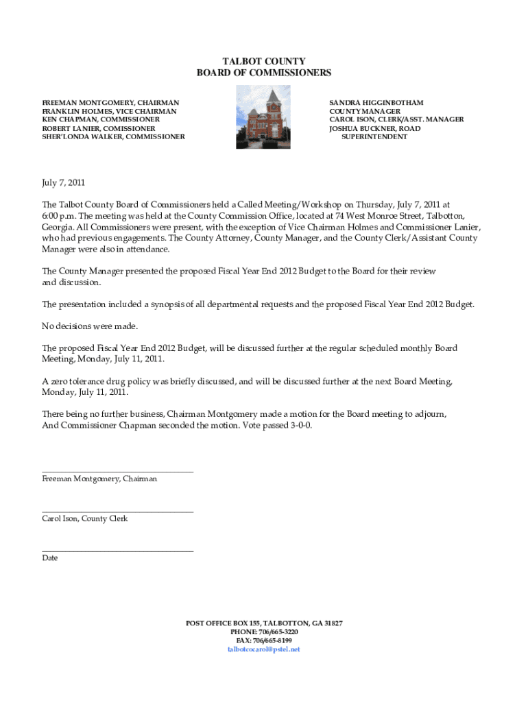 TALBOT COUNTY BOARD OF COMMISSIONERS FREEMAN MONTGOMERY, CHAIRMAN FRANKLIN HOLMES, VICE CHAIRMAN KEN CHAPMAN, COMMISSIONER ROBERT LANIER, COMISSIONER SHERLONDA WALKER, COMMISSIONERSANDRA HIGGINBOTHAM