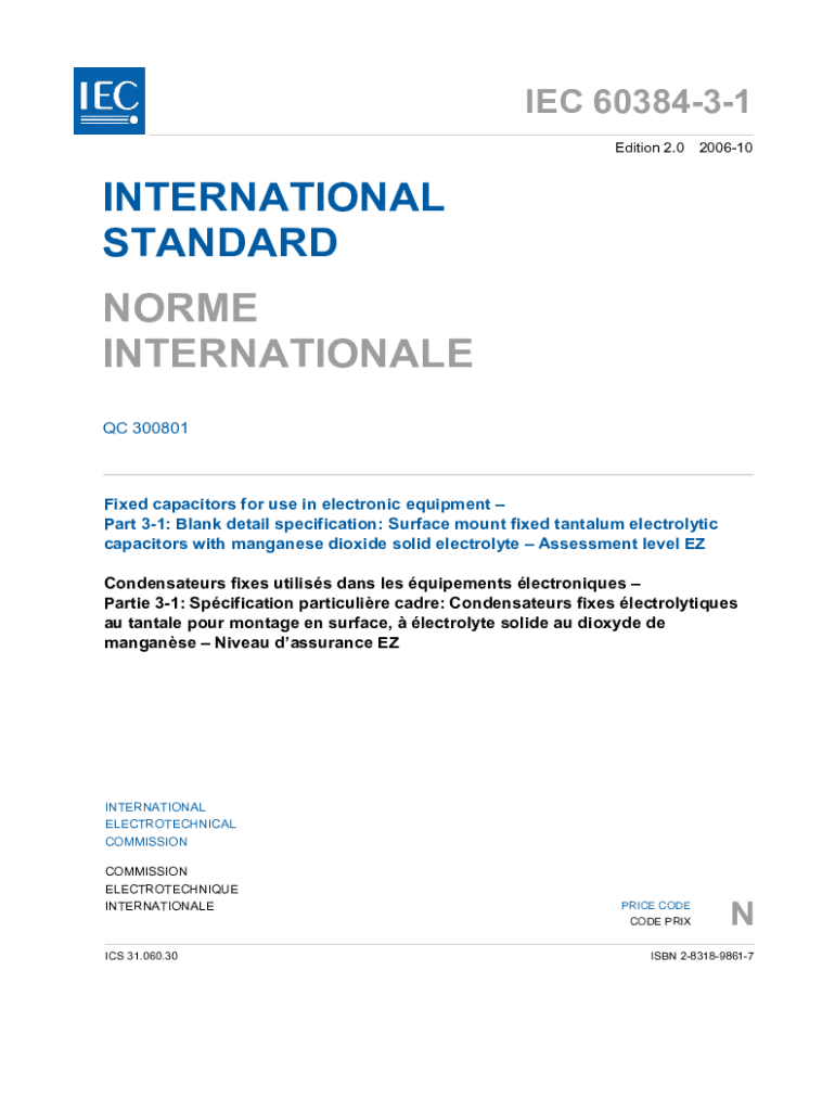 IEC 6038431 Edition 2.0200610INTERNATIONAL STANDARD NORME INTERNATIONALE QC 300801Fixed capacitors for use in electronic equipment Part 31: Blank detail specification: Surface mount fixed tantalum