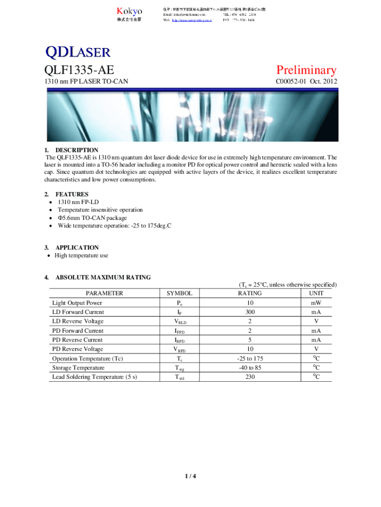 QLF1335AEPreliminary1310 nm FP LASER TOCANC0005201 Oct. 20121. DESCRIPTION The QLF1335AE is 1310 nm quantum dot laser diode device for use in extremely high temperature environment. The laser is mounted