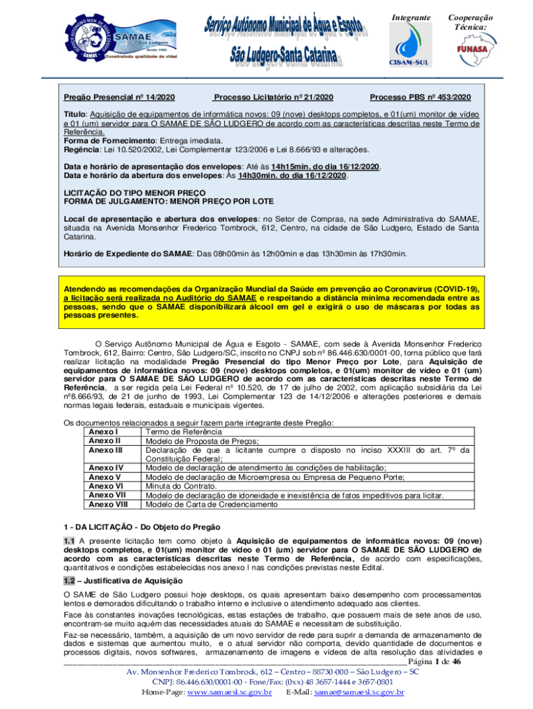 Tunica:PRESO Presence n 14/2020Processo Limitation n 21/2020Processo PBS n 453/2020Ttulo: Aquino de equipments de Informatica novas: 09 (love) desktops completes, e 01(um) monitor