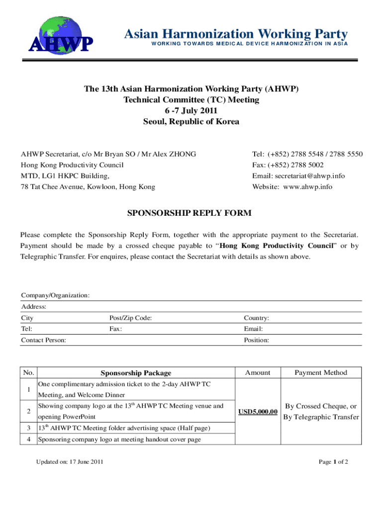 Asian Harmonization Working Party W O R K I N G T O W AR D S M E D I C AL D E V I C E H AR M O N I Z AT I O N I N AS I AThe 13th Asian Harmonization Working Party (AHWP) Technical Committee (TC) Meeting