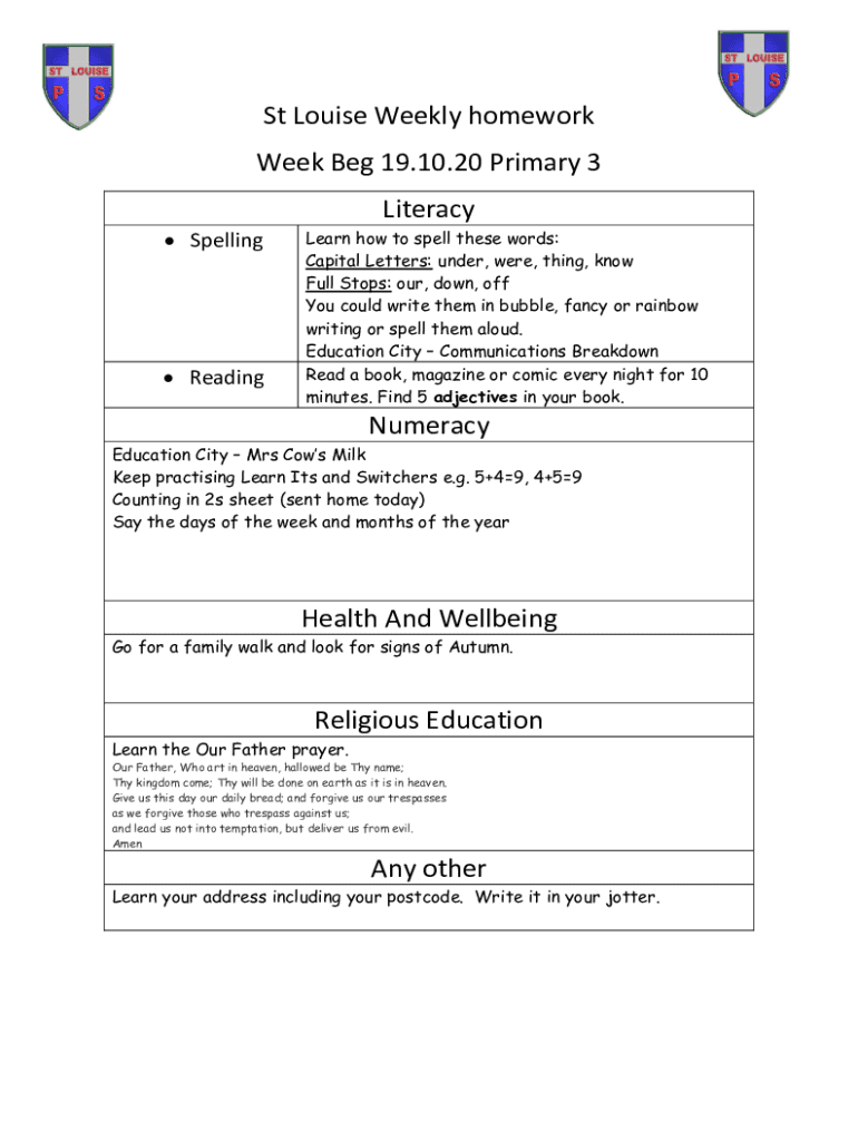 Get the free St Louise Weekly homework Week Beg 19.10.20 ...