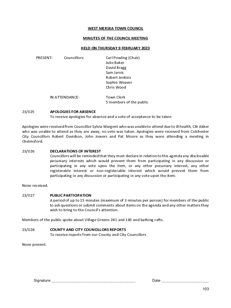 WEST MERSEA TOWN COUNCIL MINUTES OF THE COUNCIL MEETING HELD ON THURSDAY 9 FEBRUARY 2023 PRESENT:Councillors:IN ATTENDANCE:23/025Carl Powling (Chair) Julie Baker David Bragg Sam Jarvis Robert Jenkins