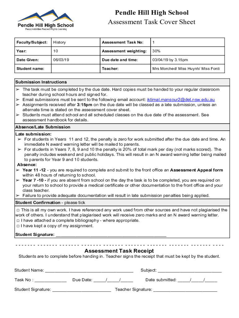 Pendle Hill High School Assessment Task Cover Sheet Faculty/Subject:HistoryAssessment Task No:1Year:10Assessment weighting:30%Date Given:06/03/19Due date and time:03/04/19 by 3.15pmTeacher:Mrs Morched/