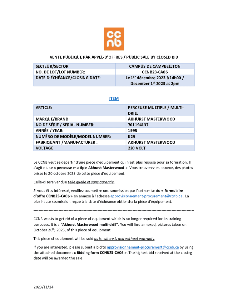 VENTE PUBLIQUE PAR APPELDOFFRES / PUBLIC SALE BY CLOSED BID SECTEUR/SECTOR: NO. DE LOT/LOT NUMBER: DATE DCHANCE/CLOSING DATE:CAMPUS DE CAMPBELLTON CCNB23CA06 Le 1er dcembre 2023 14h00 / December 1st