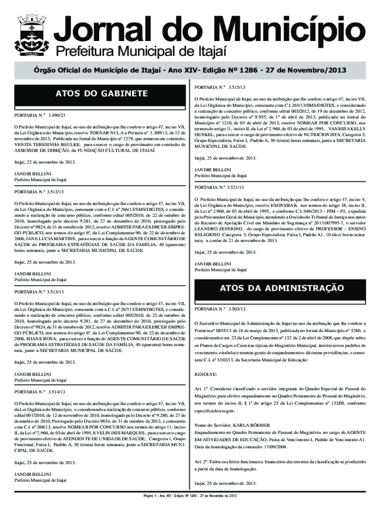 Jornal do Municpio Prefeitura Municipal de Itaja rgo Oficial do Municpio de Itaja Ano XIV Edio N 1286 27 de Novembro/2013ATOS DO GABINETE PORTARIA N. 3.490/23 O Prefeito Municipal de Itaja, no uso