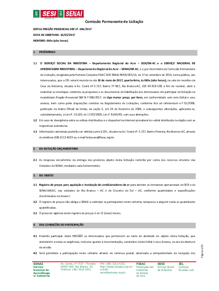 Comisso Permanente de Licitao EDITAL PREGO PRESENCIAL SRP n. 006/2017 DATA DE ABERTURA: 10/05/2017 HORRIO: 08hs (oito horas)1.1.1PREMBULOO SERVIO SOCIAL DA INDSTRIA Departamento Regional do Acre SESI/DRAC