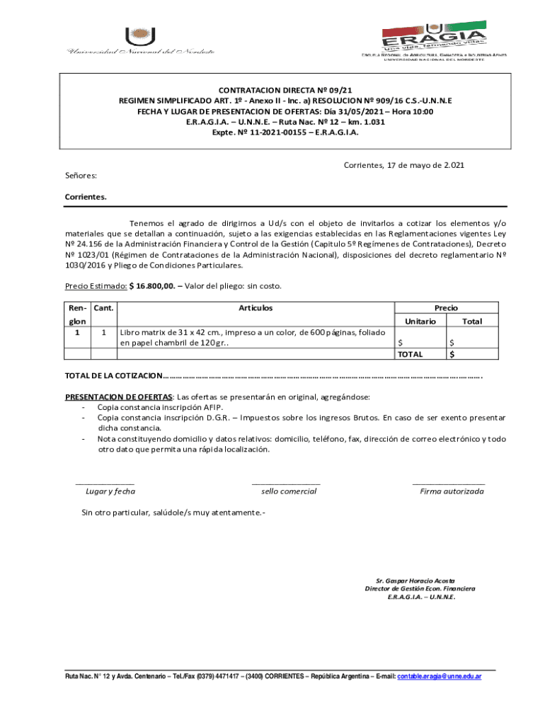 CONTRATACION DIRECTA N 09/21 REGIMEN SIMPLIFICADO ART. 1 Anexo II Inc. a) RESOLUCION N 909/16 C.S.U.N.N.E FECHA Y LUGAR DE PRESENTACION DE OFERTAS: Da 31/05/2021 Hora 10:00 E.R.A.G.I.A. U.N.N.E. Ruta