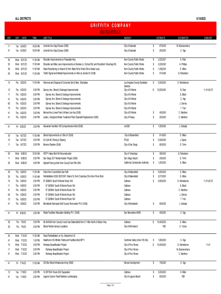 ALL DISTRICTS6/19/2023GRIFFITH COMPANY BID SCHEDULE TIMEJOB TITLEAGENCY6/20/2310:00 AMLimonite Ave Gap Closure (SUB)City of Eastvale$870,000M. Buenaventura6/20/2310:00 AMLimonite Ave Gap Closure (SUB)City