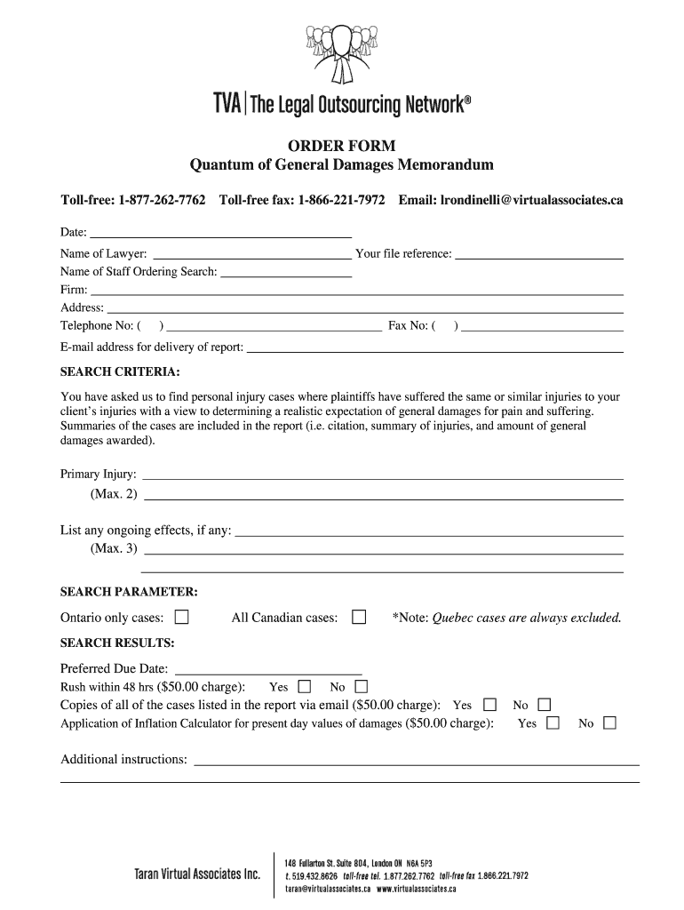 ORDER FORM Quantum of General Damages Memorandum Toll-free: 1-877-262-7762 Toll-free fax: 1-866-221-7972 Email: lrondinelli virtual associates.ca Date: Your file reference: Name of Lawyer: Name of