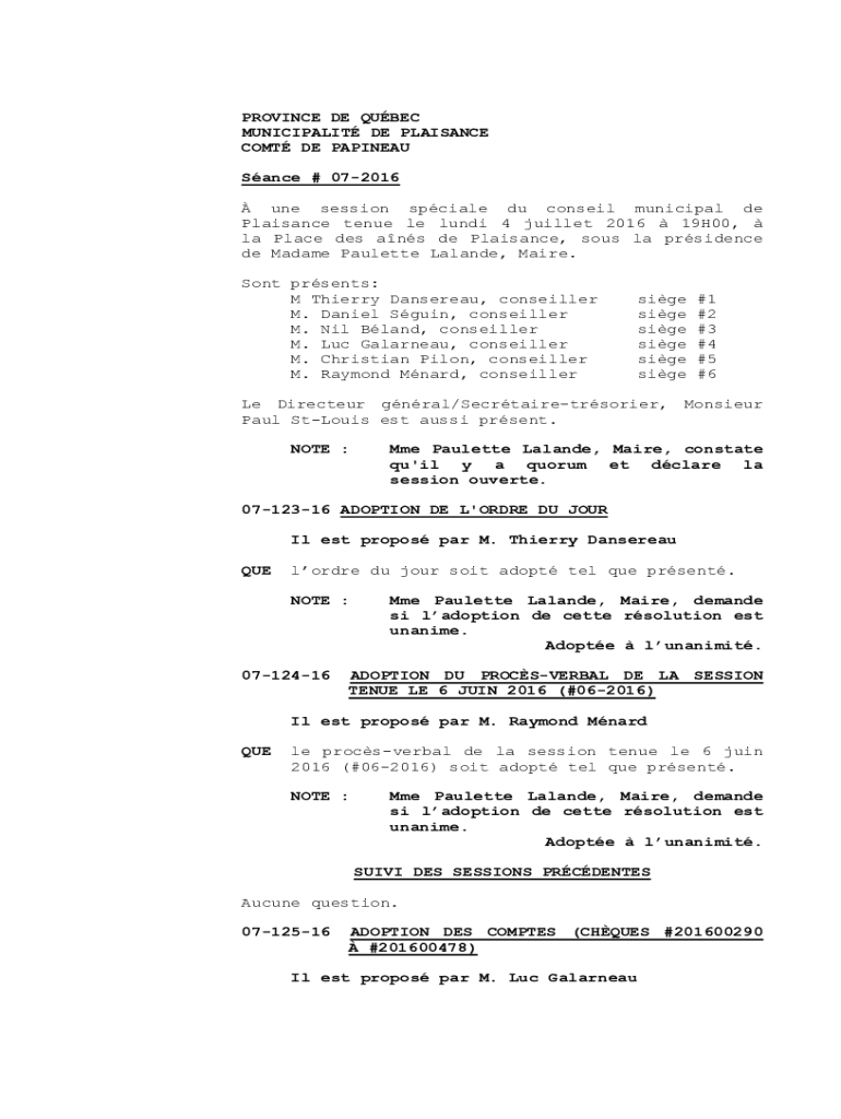 PROVINCE DE QUBEC MUNICIPALIT DE PLAISANCE COMT DE PAPINEAU Sance # 072016 une session spciale du conseil municipal de Plaisance tenue le lundi 4 juillet 2016 19H00, la Place des ans de Plaisance,