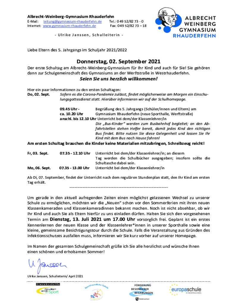 AlbrechtWeinbergGymnasium Rhauderfehn EMail: leitung@gymnasiumrhauderfehn.de Internet: www.gymnasiumrhauderfehn.deTel.: 0 49 52/82 73 0 Fax: 0 49 52/82 73 18 Ulrike Janssen, Schulleiterin Liebe Eltern