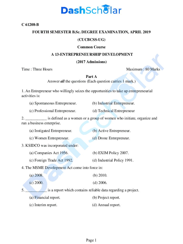 C 61208B FOURTH SEMESTER B.Sc. DEGREE EXAMINATION, APRIL 2019 (CUCBCSSUG) Common Course A 13ENTREPRENEURSHIP DEVELOPMENT (2017 Admissions) Time : Three HoursMaximum : 80 MarksPart A Answer all the
