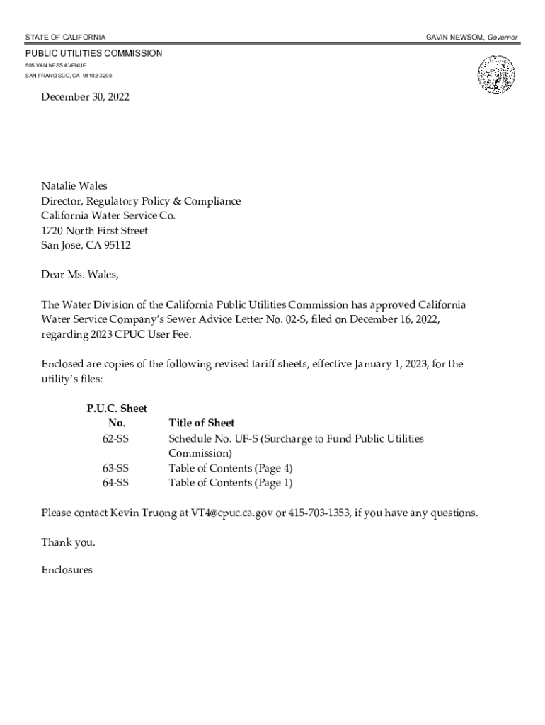STATE OF CALIFORNIAGAVIN NEWSOM, GovernorPUBLIC UTILITIES COMMISSION 505 VAN NESS AVENUE SAN FRANCISCO, CA 941023298December 30, 2022Natalie Wales Director, Regulatory Policy & Compliance California