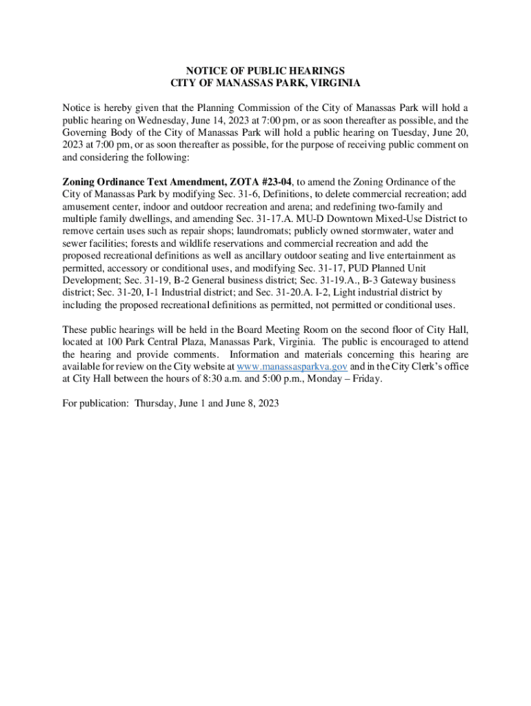 NOTICE OF PUBLIC HEARINGS CITY OF MANASSAS PARK, VIRGINIA Notice is hereby given that the Planning Commission of the City of Manassas Park will hold a public hearing on Wednesday, June 14, 2023 at